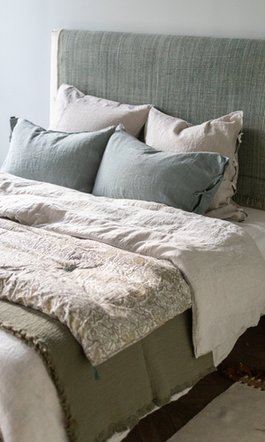 Estampada artesanalmente en la región de Rajasthan (India) mediante serigrafía tradicional, cada Liao es una muestra de paciencia y precisión, con detalles que revelan el cuidado de manos expertas. Los cojines decorativos como este elevan la experiencia del descanso y la mirada del interiorista, integrando fácilmente en dormitorios, salones y espacios personales.