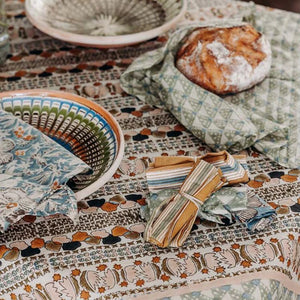 Las servilletas Impro son una celebración de la artesanía textil y de la libertad creativa a la mesa. Confeccionadas en voile de algodón ligero y suave, están estampadas a mano con la técnica tradicional de block print, lo que hace que cada pieza tenga un carácter único.